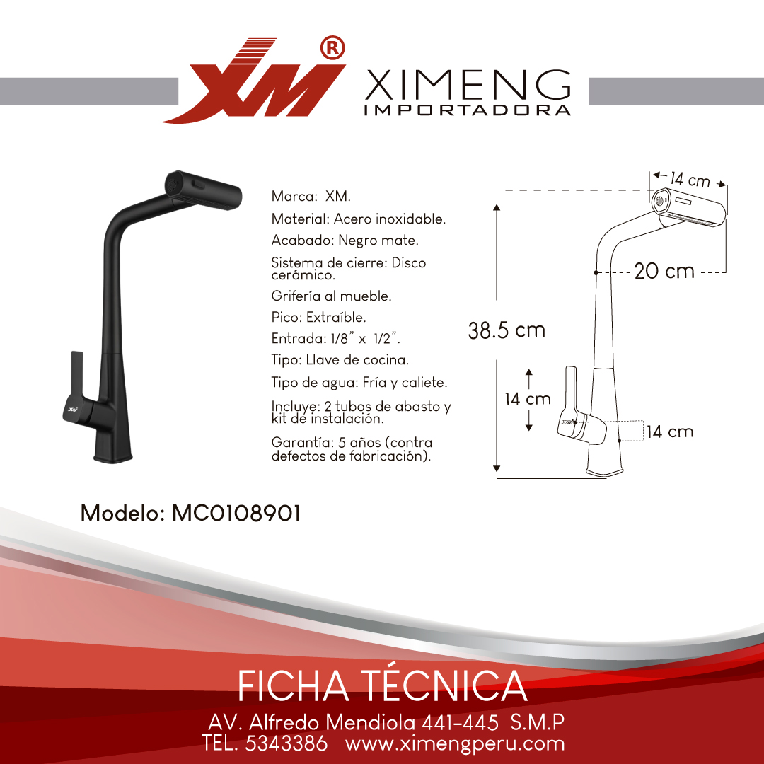 La mezcladora cumple perfectamente con lo esperado. Su acabado negro mate es muy elegante y el pico extraíble facilita mucho la limpieza del fregadero. La instalación fue sencilla y el disco cerámico asegura un buen control del agua. Una compra muy acertada por su calidad y diseño.