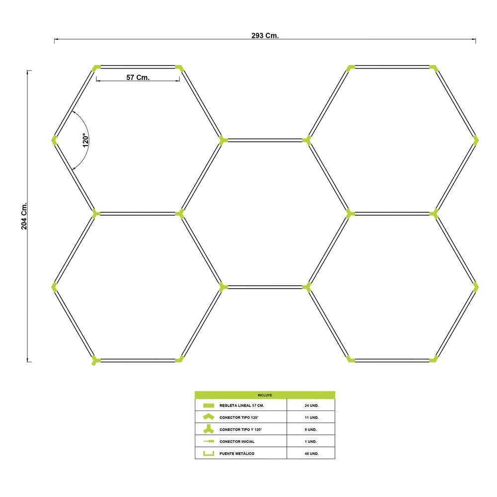 - Kit de 24 regletas LED de 60 cm cada una, que se ensamblan para formar cinco hexágonos.